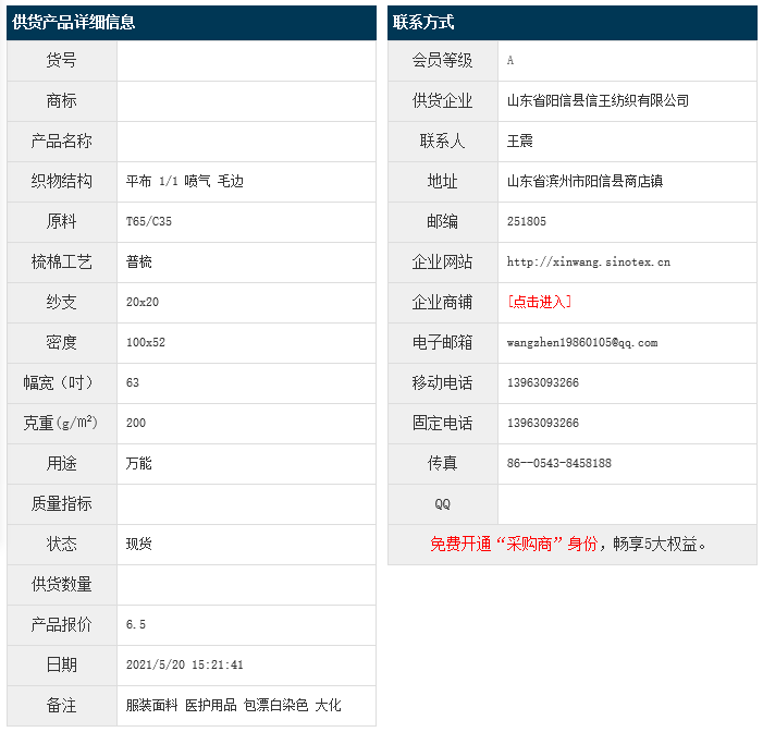 5月20日,山東陽(yáng)信縣信王紡織有限公司滌棉平布T65/C35 20x20 100x52 63" 1/1 噴氣 毛邊,報(bào)價(jià)為6.5元/米,實(shí)際成交價(jià)以協(xié)商為準(zhǔn)。[點(diǎn)擊查看詳情]