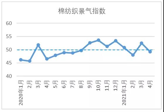 說明:中國棉紡織行業(yè)景氣指數(shù)采集自全國近500家次棉紡織企業(yè),參考國家制造業(yè)PMI等指數(shù)制定方式,通過對多個主要指標(biāo)加權(quán)計算得出,當(dāng)指數(shù)高于50,表示棉紡織行業(yè)本月景氣程度好于上月,低于50則表示本月景氣程度不及上月。