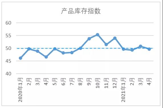 4月,產(chǎn)品庫存指數(shù)49.71,較3月指數(shù)下降1.05。當(dāng)月,國內(nèi)市場產(chǎn)銷基本順暢,外貿(mào)訂單受疫情和船運等問題受阻。從調(diào)研情況看,紡紗企業(yè)庫存依然處于較低水平,基本維持在1個月以內(nèi);織造企業(yè)中生產(chǎn)常規(guī)產(chǎn)品企業(yè)庫存小幅增加,基本在1-1.5個月。調(diào)查數(shù)據(jù)顯示,紗庫存量環(huán)比下降的企業(yè)占比為39.85%,高于上升企業(yè)占比4.13個百分點,布庫存量環(huán)比上升的企業(yè)占比為46.37%,高于下降企業(yè)占比13.47個百分點。