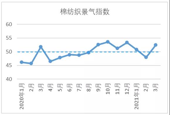 說明:中國棉紡織行業(yè)景氣指數(shù)采集自全國近500家次棉紡織企業(yè),參考國家制造業(yè)PMI等指數(shù)制定方式,通過對多個(gè)主要指標(biāo)加權(quán)計(jì)算得出,當(dāng)指數(shù)高于50,表示棉紡織行業(yè)本月景氣程度好于上月,低于50則表示本月景氣程度不及上月。