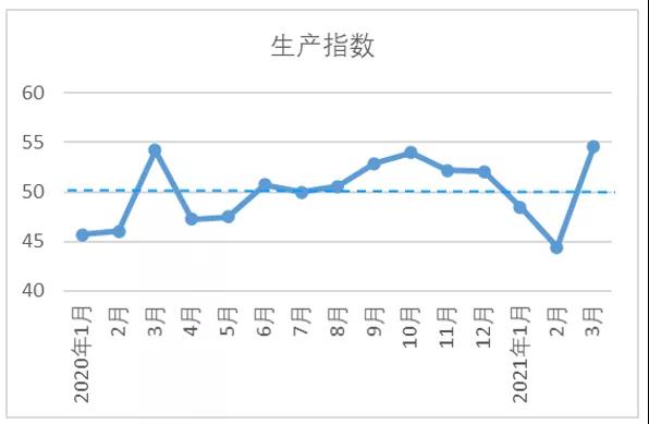 3月,生產(chǎn)指數(shù)54.61,較2月指數(shù)上升10.2。當(dāng)月,企業(yè)訂單充足,基本滿負(fù)荷生產(chǎn)。根據(jù)調(diào)研了解,紡紗企業(yè)的開工情況略好于織造企業(yè),除少數(shù)企業(yè)因設(shè)備升級改造,部分機(jī)臺(tái)停產(chǎn)外,多數(shù)企業(yè)紡紗設(shè)備開臺(tái)率基本保持100%,織造企業(yè)設(shè)備開臺(tái)率基本維持在90%以上。產(chǎn)量方面,3月企業(yè)生產(chǎn)天數(shù)增加,紗、布產(chǎn)量均較2月環(huán)比大幅增加。根據(jù)調(diào)查數(shù)據(jù),3月,開機(jī)率環(huán)比上升的企業(yè)占比為31.44%,紗產(chǎn)量環(huán)比上升的企業(yè)占比為71.31%,布產(chǎn)量環(huán)比上升的企業(yè)占比為70.33%。