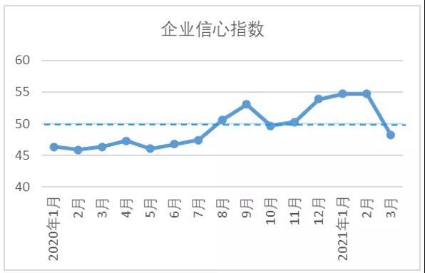 3月,企業(yè)信心指數(shù)48.71,較2月指數(shù)下降6.53。當(dāng)月,海外疫情再度反彈,市場擔(dān)憂情緒升溫,歐美量化寬松政策引發(fā)全球金融市場的不穩(wěn)定性明顯增加,中美貿(mào)易關(guān)系持續(xù)緊張,尤其是下半年,企業(yè)表示存在較大不確定性。國內(nèi)方面,雖1季度國民經(jīng)濟(jì)開局良好,但經(jīng)濟(jì)恢復(fù)的基礎(chǔ)還不牢固,內(nèi)需市場在開辟過程中又出現(xiàn)一些新情況新問題。整體看,企業(yè)對于后市的信心較2月減弱。據(jù)調(diào)查數(shù)據(jù),3月,認(rèn)為后市樂觀向好的企業(yè)占比為23.68%,認(rèn)為后市弱勢下行的企業(yè)占比為36.55%。