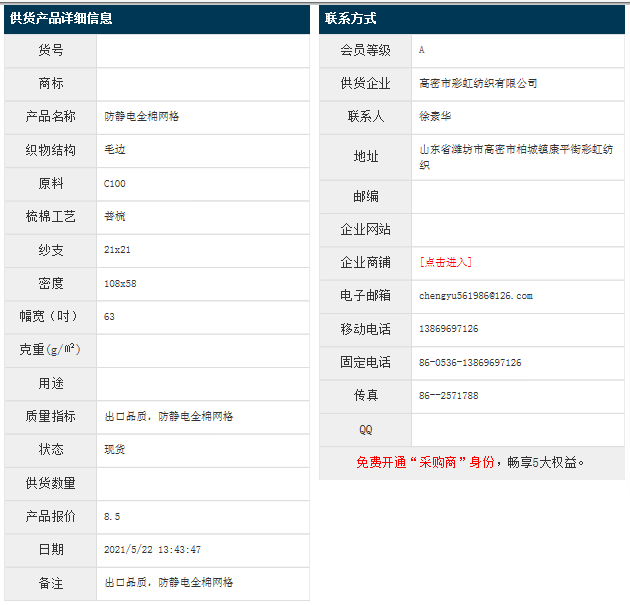 5月22日,高密彩虹紡織有限公司防靜電純棉網(wǎng)格C100 21x21 108x58 63" 毛邊,報(bào)價(jià)為8.5元/米,實(shí)際成交價(jià)以協(xié)商為準(zhǔn)。[點(diǎn)擊查看詳情]