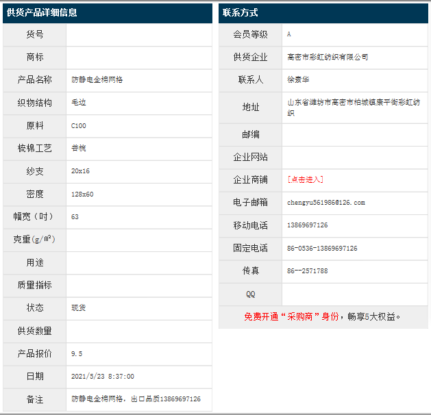 5月23日,高密彩虹紡織有限公司防靜電純棉網格C100 20x16 128x60 63" 毛邊,報價為9.5元/米,實際成交價以協(xié)商為準。[點擊查看詳情]