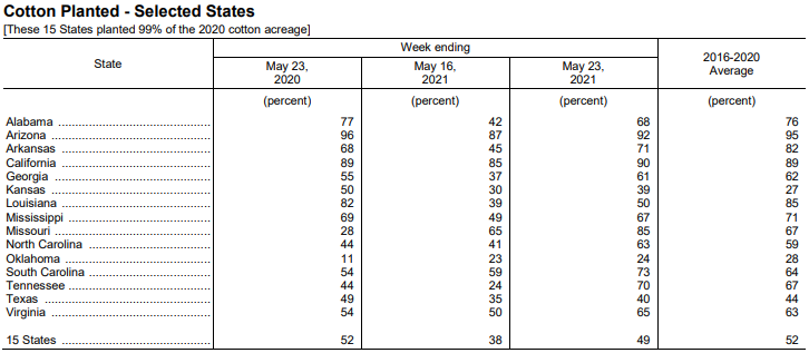 美國農(nóng)業(yè)部5月24日發(fā)布的美國棉花生長報(bào)告顯示,截至5月23日當(dāng)周,美棉種植率為49%,前周為38%,去年同期為52%,5年均值為52%。隨著播種大面積展開,絕大部分州進(jìn)度已趕上或超過往年同期,只有得州、路易斯安那州、堪薩斯州的進(jìn)度大幅落后往年。