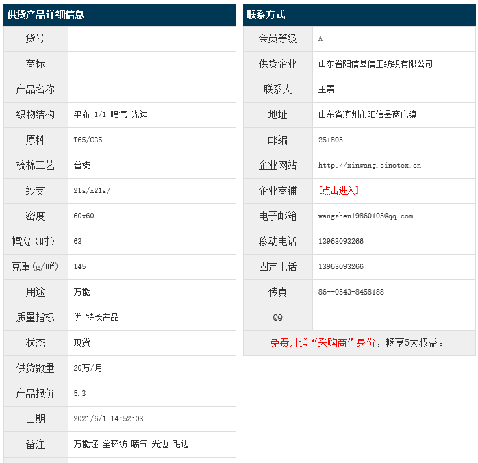6月1日,山東陽信縣信王紡織有限公司滌棉平布T65/C35 21x21 60x60 63" 1/1 145g/㎡ 噴氣 光邊,報價為5.3元/米,實際成交價以協(xié)商為準。[點擊查看詳情]