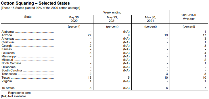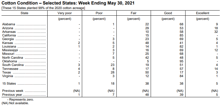 美國(guó)農(nóng)業(yè)部6月1日發(fā)布的美國(guó)棉花生長(zhǎng)報(bào)告顯示,截至5月30日當(dāng)周,美棉種植率為64%,前周為49%,去年同期為64%,五年均值為65%。美棉現(xiàn)蕾率為6%,去年同期為8%,五年均值為7%。美棉生長(zhǎng)優(yōu)良率為43%,去年同期為44%。