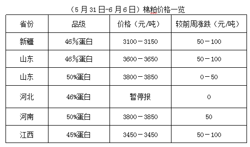 上周,豆粕期貨周一至周四低位震蕩反彈,周五滯漲回落,較上周五略漲?,F(xiàn)貨震蕩調整。周末沿海地區(qū)43%蛋白豆粕價3460-3600元/噸,較前周(5月24-28日)上調40-60元/噸。棉籽價格高位再沖,油棉廠停收現(xiàn)象增加,開工率下降,棉粕供應不足,廠家對棉粕持價出貨,個別報價持續(xù)上漲。但目前棉粕價格與豆粕多已形成倒掛,市場需求受到一定限制。但因目前棉粕蛋白含量多為46%以上,與43%蛋白豆粕相比仍有一定優(yōu)勢,特別是水產養(yǎng)殖需料,目前正值大量投放期,或對棉粕形成一定支撐。新籽上市前,棉粕貨少優(yōu)勢明顯,參照豆粕走勢前提下,棉粕易漲難跌之勢仍難改變。