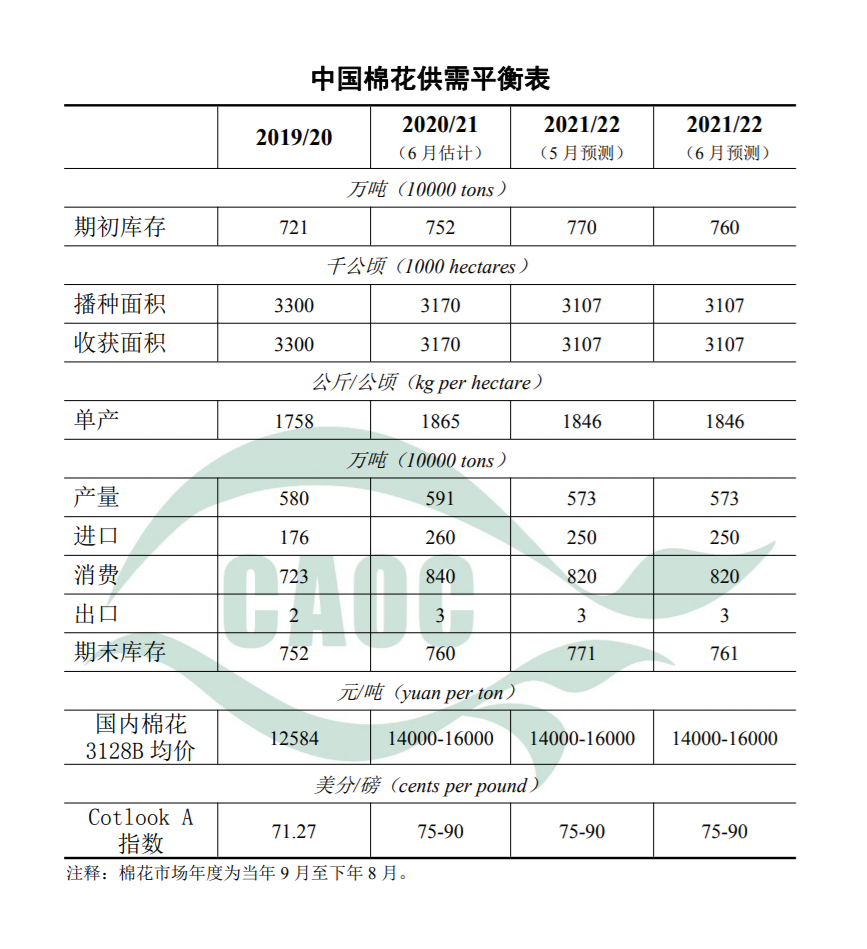 本月估計,2020/21年度紡織品服裝出口形勢向好,企業(yè)訂單好于預期,消費量調(diào)增30萬噸至840萬噸,進口上調(diào)20萬噸至260萬噸,期末庫存降至760萬噸。本月預測,全國棉花生長氣象條件較適宜,好于近五年平均水平,2021/22年度棉花播種面積、產(chǎn)量和消費量維持上月不變。