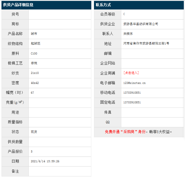 6月14日,武陟縣華昌紡織有限公司純棉絨布C100 21x10 40x42 67",報價為5元/米,實際成交價以協(xié)商為準。[點擊查看詳情]