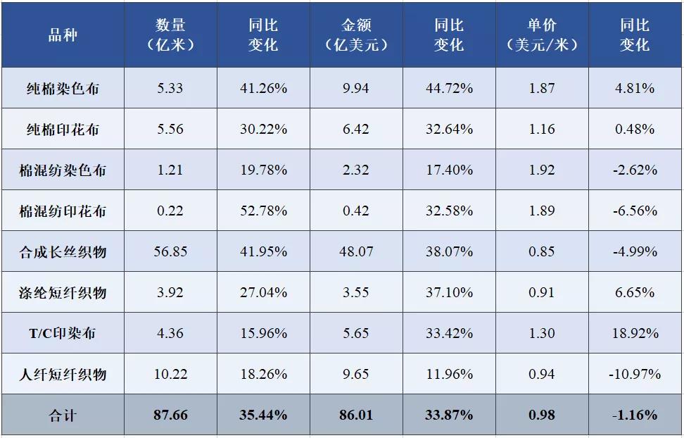 表3 2021年1-4月印染八大類產(chǎn)品出口情況