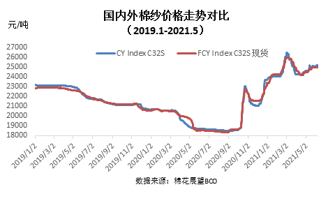 本月內(nèi)外棉紗價(jià)格上漲,國產(chǎn)32支純棉紗5月均價(jià)25000元/噸,較上月上漲653元,漲幅2.68%,較去年同期上漲6259元,漲幅33.4%;進(jìn)口32支純棉紗5月均價(jià)24832元/噸,較上月上漲440元,漲幅1.8%,較去年同期上漲5990元,漲幅31.8%。