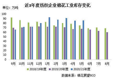當(dāng)前紡織企業(yè)紗線庫存8.12天,較上月減少1.93天。坯布庫存15.42天,較上月減少1.36天。