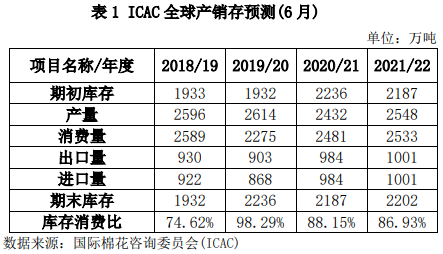 國際棉花咨詢委員會(ICAC)首次發(fā)布2021/22年度全球棉花產(chǎn)銷存預測數(shù)據(jù),2021/22年度全球棉花產(chǎn)量2548萬噸,同比增加116萬噸,增幅4.77%;消費量2533噸,同比增加52萬噸,增幅2.1%;期末庫存2202萬噸,同比增加15萬噸,增幅0.69%;全球產(chǎn)需狀況由2020/21年度的產(chǎn)不足需49萬噸轉(zhuǎn)變?yōu)?021/22年度的產(chǎn)大于需15萬噸;2021/22年度全球庫存消費比為86.93%,較2021/22年的88.15%下降1.22個百分點。
