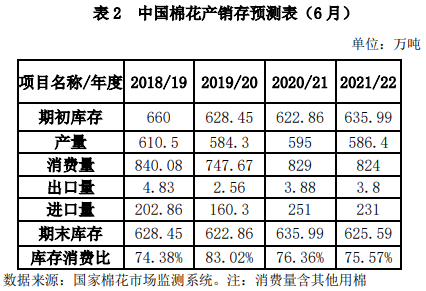 基于相關專題調(diào)查和對國內(nèi)外經(jīng)濟環(huán)境及市場狀況的分析,2021年6月國家棉花市場監(jiān)測系統(tǒng)對2021/22年度國內(nèi)棉花產(chǎn)銷存預測如下:2021/22年度我國棉花產(chǎn)量586.4萬噸,同比減少8.6萬噸,減幅1.45%;消費量824萬噸,同比減少5萬噸,減幅0.6%;期末庫存625.59萬噸,同比減少10.4萬噸,減幅1.64%;產(chǎn)需缺口237.6萬噸,較2020/21年度擴大3.6萬噸,庫存消費比為75.57%,較2020/21年度下降0.79個百分點。