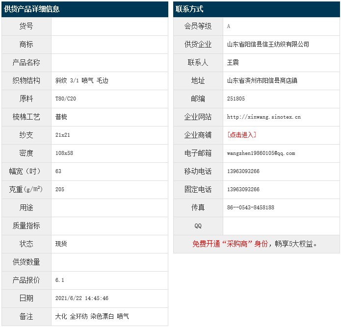 6月22日,山東陽信縣信王紡織有限公司滌棉斜紋T80/C20 21x21 108x58 63" 3/1 205g/㎡ 噴氣 毛邊,報價為6.1元/米,實際成交價以協(xié)商為準。[點擊查看詳情]