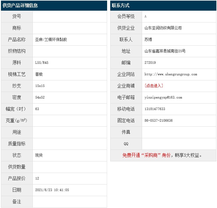 6月23日,山東圣潤紡織有限公司麻粘布(亞麻/蘭精環(huán)保粘膠)L55/R45 15x15 54x52 63",報價為12元/米,實際成交價以協(xié)商為準。[點擊查看詳情]