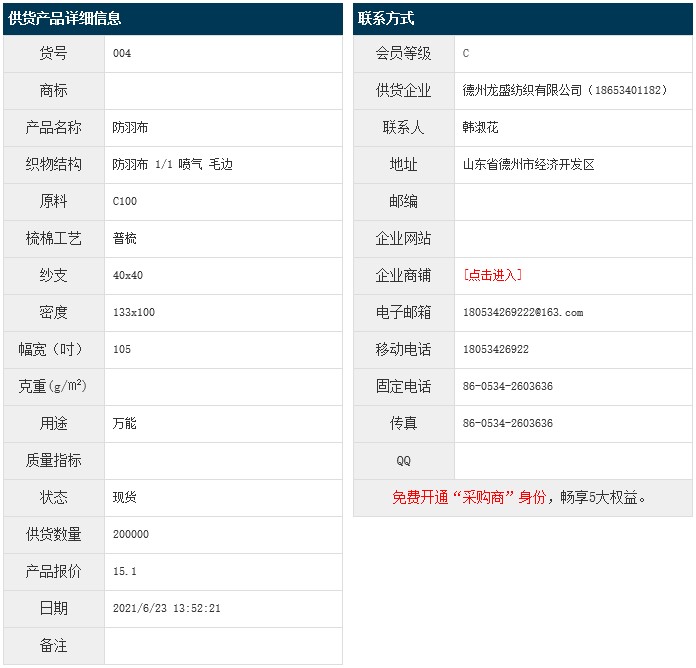 6月23日,德州龍盛紡織有限公司純棉防羽布C100 40x40 133x100 105" 1/1 噴氣 毛邊,報價為15.1元/米,實際成交價以協(xié)商為準。[點擊查看詳情]