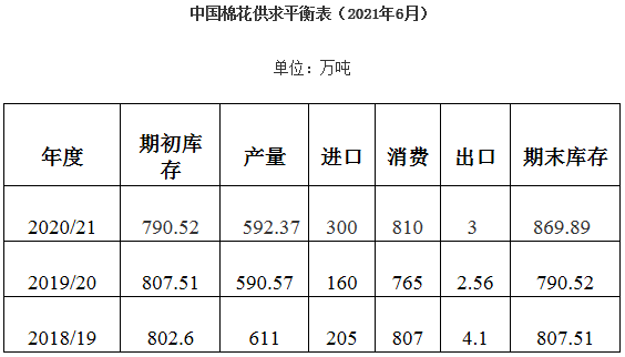 5月,國(guó)內(nèi)紡織訂單充足,原料需求穩(wěn)定,商業(yè)庫(kù)存繼續(xù)下降。國(guó)內(nèi)有關(guān)部門(mén)嚴(yán)控大宗商品價(jià)格上漲,國(guó)內(nèi)棉價(jià)先升后降。據(jù)中國(guó)棉花協(xié)會(huì)調(diào)查,2021年度全國(guó)植棉面積同比減少5.66%,降幅較上期有所擴(kuò)大,主要是新疆受不利天氣影響,部分棉農(nóng)改種其他農(nóng)作物;月底全國(guó)棉花播種基本完成,進(jìn)度快于去年,但長(zhǎng)勢(shì)差于去年。中國(guó)棉花協(xié)會(huì)預(yù)計(jì),2020/21年度棉花進(jìn)口量為300萬(wàn)噸,同比增長(zhǎng)87%,較上期調(diào)增65萬(wàn)噸;期末庫(kù)存相應(yīng)調(diào)整為870萬(wàn)噸,同比增長(zhǎng)10%,較上期調(diào)增65萬(wàn)噸;消費(fèi)量810萬(wàn)噸,同比增長(zhǎng)5.9%;產(chǎn)量592萬(wàn)噸,同比持平略增。