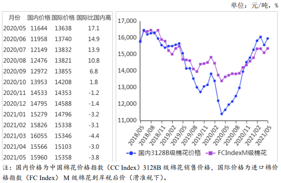 (一)國內(nèi)棉價環(huán)比上漲。5月,印度疫情爆發(fā)導(dǎo)致部分訂單回流國內(nèi),我國1季度經(jīng)濟(jì)數(shù)據(jù)好于預(yù)期,紡織企業(yè)原料采購積極性較高,國內(nèi)棉價環(huán)比上漲。據(jù)《中國棉花工業(yè)庫存調(diào)查報告》數(shù)據(jù),5月初,準(zhǔn)備采購棉花的企業(yè)占69.6%,環(huán)比增11.7個百分點,同比增19.6個百分點。5月,國內(nèi)3128B級棉花月均價每噸15960元,環(huán)比漲2.5%,同比漲37.1%。鄭棉期貨主力合約(CF109)月結(jié)算價每噸15780元,環(huán)比漲3.5%,同比漲37.0%。