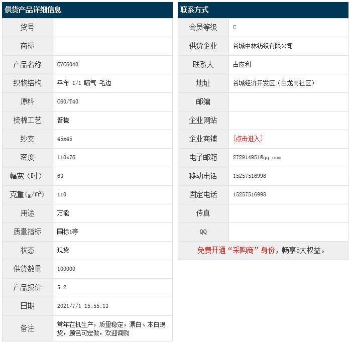 7月1日,谷城中林紡織有限公司滌棉平布CVC60/40 45x45 110x76 63" 1/1 110g/㎡ 噴氣 毛邊,報(bào)價(jià)為5.2元/米,實(shí)際成交價(jià)以協(xié)商為準(zhǔn)。[點(diǎn)擊查看詳情]