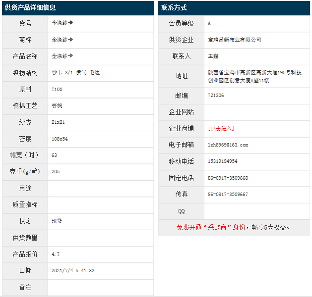 7月3日,寶雞昌新布業(yè)有限公司純滌紗卡T100 21x21 108x54 63" 3/1 205g/㎡ 噴氣 毛邊,報(bào)價(jià)為4.7元/米,實(shí)際成交價(jià)以協(xié)商為準(zhǔn)。[點(diǎn)擊查看詳情]
