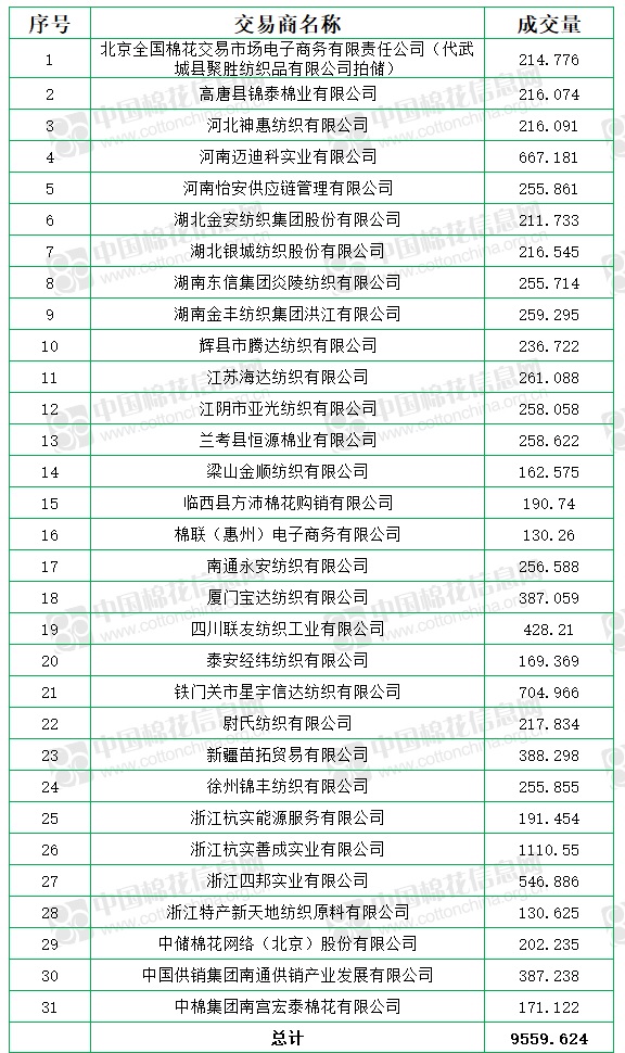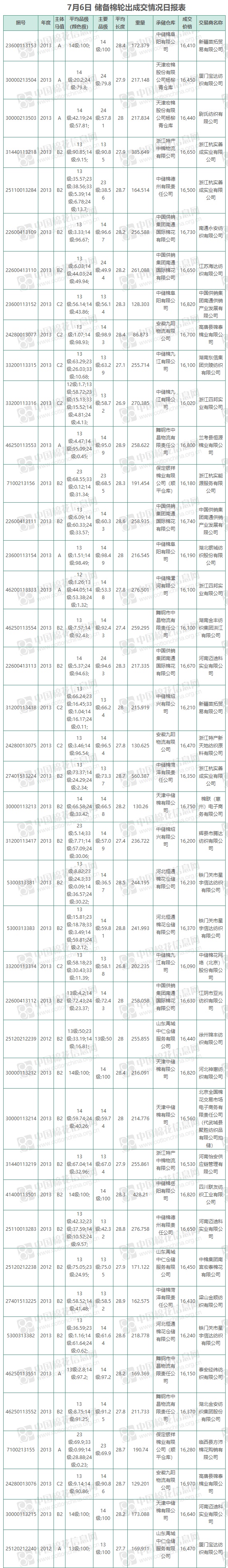 7月6日儲備棉輪出銷售資源9559.624噸,實際成交9559.624噸,成交率100%,成交均價16455元/噸,較5日上漲55元/噸,折3128價格17802元/噸,較5日上漲84元/噸,成交最高價16970元/噸,最低價16020元/噸