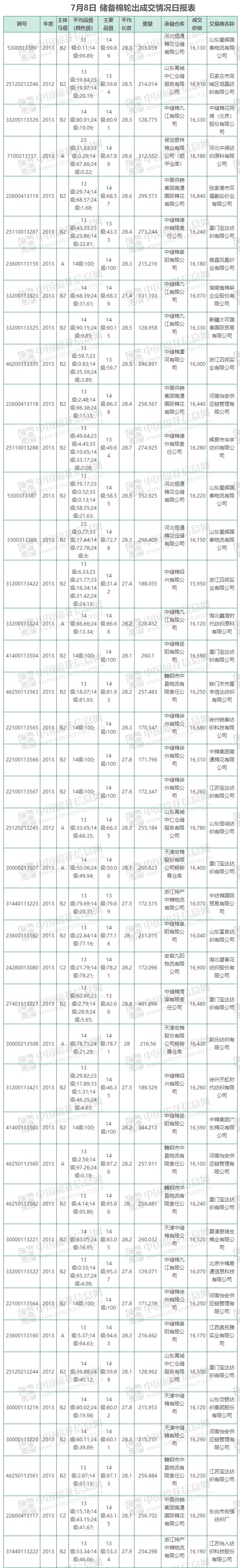 7月8日儲(chǔ)備棉輪出銷售資源9610.83噸,實(shí)際成交9610.83噸,成交率100%,成交均價(jià)16331元/噸,較7日下跌96元/噸,折3128價(jià)格17708元/噸,較7日下跌78元/噸,成交最高價(jià)16910元/噸,最低價(jià)15950元/噸。