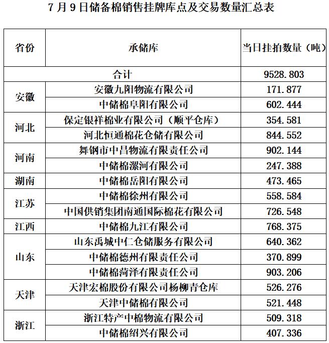 中國儲備棉管理有限公司定于7月9日上市銷售儲備棉重量9528.803噸,共43捆,其中新疆棉6400.84噸。