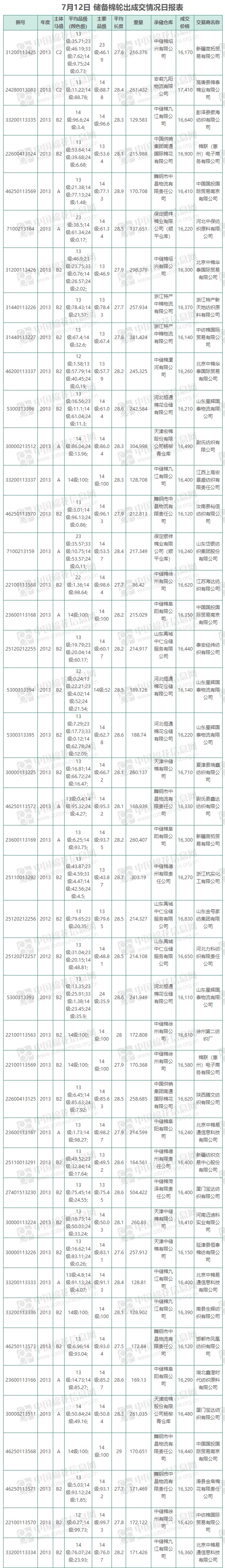 7月12日儲備棉輪出銷售資源9529.11噸,實際成交9529.11噸,成交率100%,成交均價16403元/噸,較9日上漲27元/噸,折3128價格17696元/噸,較9日下跌7元/噸。