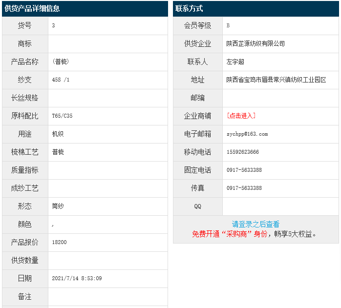 7月14日,陜西芷源紡織有限公司滌棉紗T65/C35 45S,報價為18200元/噸,實(shí)際成交價以協(xié)商為準(zhǔn)。[點(diǎn)擊查看詳情]