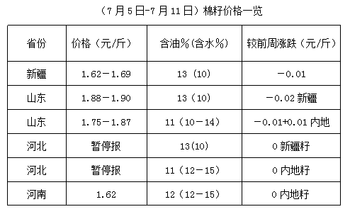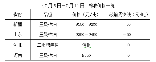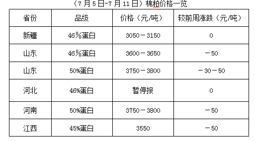 上周(7月5-11日),受棉籽貨少價堅影響,各地油棉廠復工率有限,油棉廠加工量不大,棉副產品持價運行。而期貨豆油震蕩難穩(wěn),豆粕沖高回落后震蕩運行,下游需求有所觀望。油棉廠受成本支撐,不想下調報價出貨,市場購銷略顯僵持,成交少量。因油棉廠開工率不高,棉副產品庫存暫無壓力,油棉加工淡季特點愈加明顯。