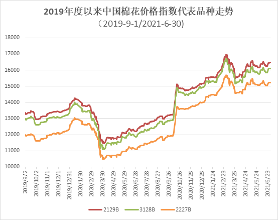 6月,受大宗商品市場(chǎng)走勢(shì)影響,國(guó)內(nèi)棉價(jià)上旬維持漲勢(shì),中下旬保持震蕩。紡織企業(yè)開工率較高,原料庫(kù)存有所下降,對(duì)棉花需求依舊較好。月底,中國(guó)棉花價(jià)格指數(shù)(CCIndex3128B)16097元/噸,環(huán)比上漲337元;月均價(jià)15985元/噸,環(huán)比上漲35元,同比上漲4027元/噸。