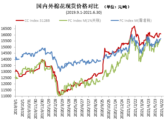 6月,國(guó)際棉花期、現(xiàn)貨價(jià)格總體上漲,中國(guó)進(jìn)口棉價(jià)格指數(shù)FCIndexM月均96.34美分/磅,環(huán)比上漲2.3美分;月底98.37美分/磅,環(huán)比上漲5.98美分,1%關(guān)稅下折人民幣15541元/噸,低于同期國(guó)內(nèi)現(xiàn)貨556元,內(nèi)外棉價(jià)差較上月末縮小418元。