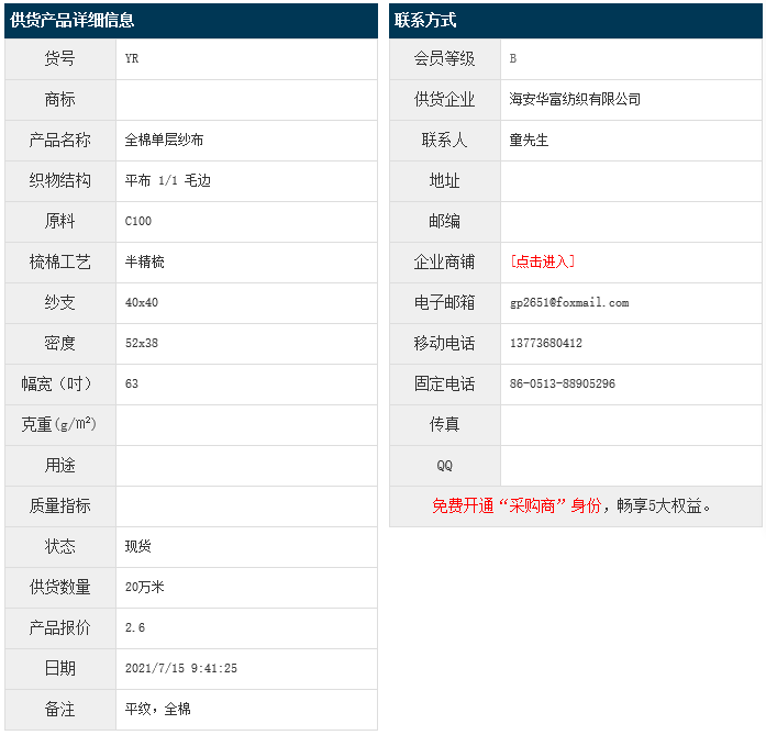 7月15日,海安華富紡織有限公司純棉單層紗布BJC100 40x40 52x38 63" 毛邊,報(bào)價(jià)為2.6元/米,實(shí)際成交價(jià)以協(xié)商為準(zhǔn)。[點(diǎn)擊查看詳情]