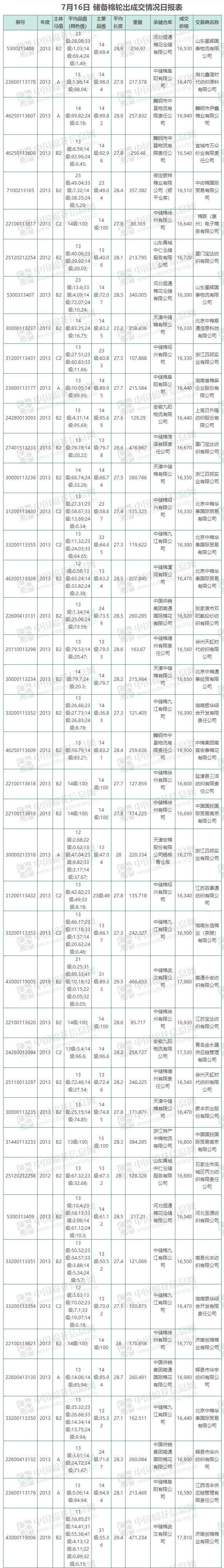 7月16日儲(chǔ)備棉輪出銷售資源9559.04噸,實(shí)際成交9559.04噸,成交率100%,成交均價(jià)16742元/噸,較15日下跌53元/噸,折3128價(jià)格17911元/噸,較15日下跌78元/噸。