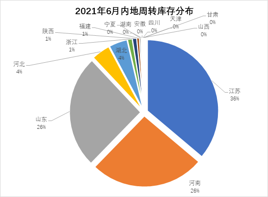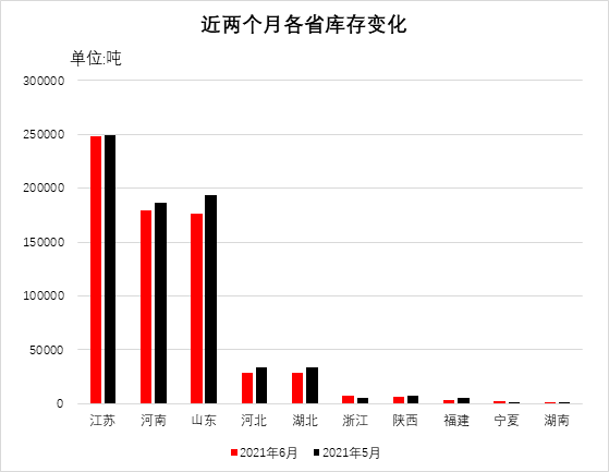 分省份看,江蘇省庫(kù)存量居首位24.83萬噸,河南省次之17.93萬噸,山東省居第三位17.68萬噸,河北省2.88萬噸,湖北省2.86萬噸,其他省均在萬噸以下。