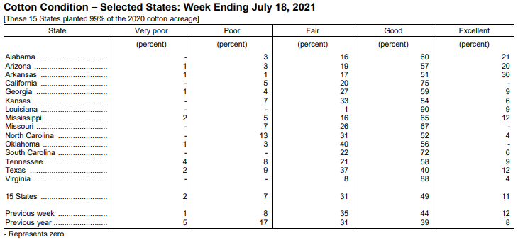 美國農(nóng)業(yè)部7月19日發(fā)布的美國棉花生長報告顯示,截至7月18日當(dāng)周,美棉現(xiàn)蕾率為69%,前周為55%,去年同期為72%,五年均值為73%。美棉結(jié)鈴率為23%,前周為16%,去年同期為26%,五年均值為30%。美棉生長優(yōu)良率為60%,前周為56%,去年同期為47%。