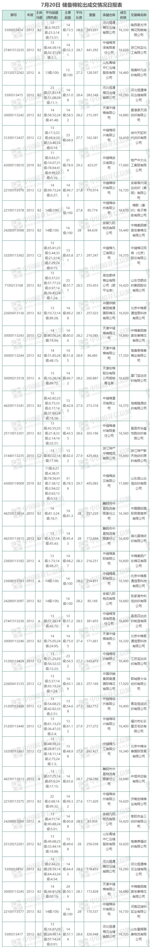 7月20日儲備棉輪出銷售資源9517.18噸,實際成交9517.18噸,成交率100%,成交均價16652元/噸,較19日下跌43元/噸,折3128價格17809元/噸,較19日下跌109元/噸。