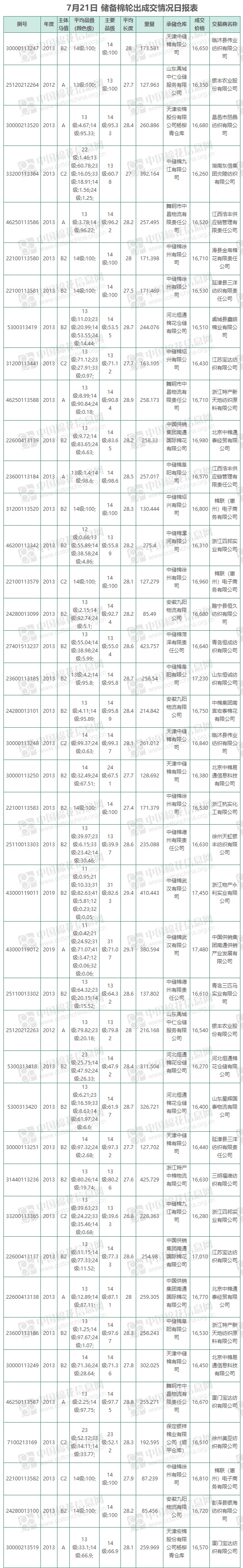 7月21日儲(chǔ)備棉輪出銷售資源9565.69噸,實(shí)際成交9565.69噸,成交率100%,成交均價(jià)16672元/噸,較20日上漲20元/噸,折3128價(jià)格17870元/噸,較20日漲61元/噸。