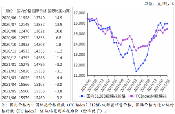 (一)國內(nèi)棉價環(huán)比持平略漲。國內(nèi)經(jīng)濟延續(xù)穩(wěn)定擴張態(tài)勢,紡織市場運行良好。據(jù)國家統(tǒng)計局?jǐn)?shù)據(jù),6月中國制造業(yè)采購經(jīng)理指數(shù)(PMI)為50.9%,繼續(xù)位于臨界點之上,紡織服裝服飾行業(yè)生產(chǎn)指數(shù)和新訂單指數(shù)均位于56.0%及以上較高景氣區(qū)間。多項保供穩(wěn)價政策陸續(xù)出臺,引導(dǎo)棉花在內(nèi)的大宗商品價格回歸供需基本面,國內(nèi)棉價上漲幅度收窄,6月國內(nèi)3128B級棉花月均價每噸15979元,環(huán)比漲0.1%,漲幅較上月減少2.4個百分點,同比漲33.6%。鄭棉期貨主力合約(CF109)月結(jié)算價每噸15768元,環(huán)比跌0.1%,同比漲34.7%。