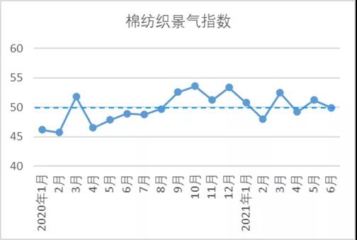 說明:中國棉紡織行業(yè)景氣指數(shù)采集自全國近500家次棉紡織企業(yè),參考國家制造業(yè)PMI等指數(shù)制定方式,通過對多個主要指標(biāo)加權(quán)計算得出,當(dāng)指數(shù)高于50,表示棉紡織行業(yè)本月景氣程度好于上月,低于50則表示本月景氣程度不及上月。