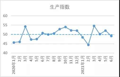 6月,生產(chǎn)指數(shù)49.15,較5月指數(shù)值下降2.92。據(jù)調(diào)研了解,大型企業(yè)開機(jī)保持高位,滿負(fù)荷生產(chǎn),中小型企業(yè)開機(jī)略有下調(diào),產(chǎn)品產(chǎn)量較5月有所下降。由于參與調(diào)查的小企業(yè)數(shù)量較高,拉動生產(chǎn)指數(shù)下降。調(diào)查數(shù)據(jù)顯示,紗產(chǎn)量環(huán)比下降企業(yè)占比為34.37%,高于上升企業(yè)占比3.98個百分點,布產(chǎn)量環(huán)比下降企業(yè)占比為41.44%,高于上升企業(yè)占比12.32個百分點,開機(jī)率下降企業(yè)占比為19.3%,高于上升企業(yè)占比9.42個百分點。