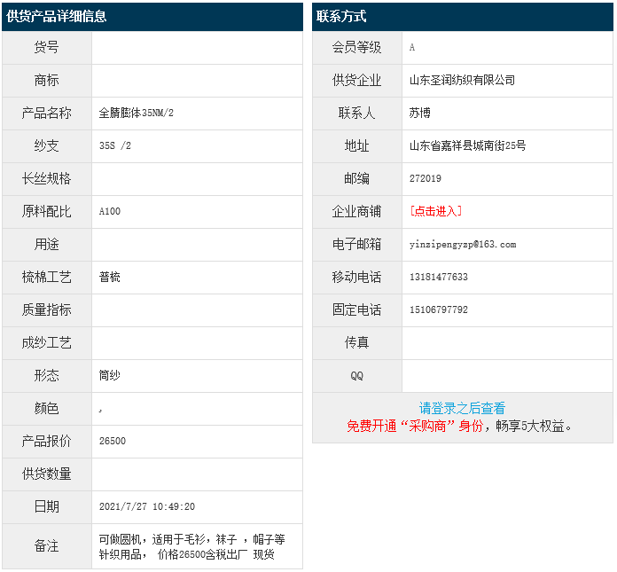 7月27日,山東圣潤紡織有限公司全腈膨體紗35NM/2,報(bào)價(jià)為26500元/噸,實(shí)際成交價(jià)以協(xié)商為準(zhǔn)。[點(diǎn)擊查看詳情]