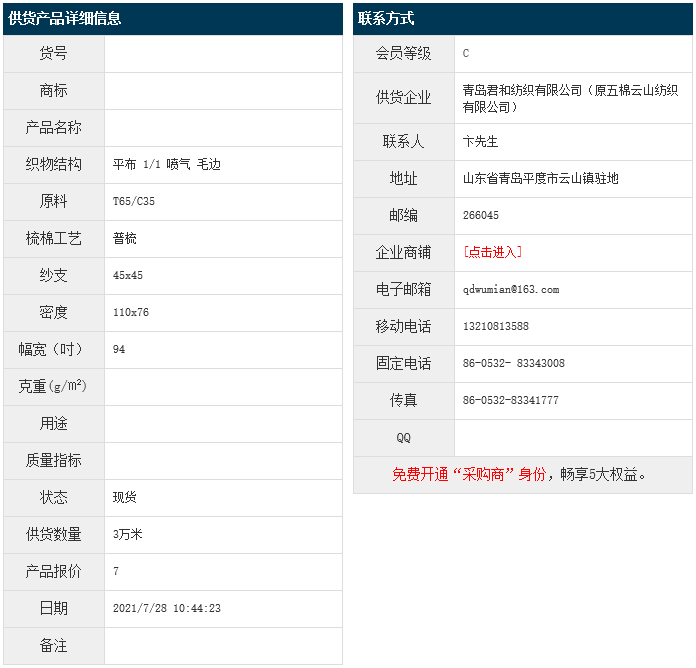 7月28日,青島君和紡織有限公司(原五棉云山紡織有限公司)滌棉平布T65/C35 45x45 110x76 94" 1/1 噴氣 毛邊,報價為7元/米,實際成交價以協(xié)商為準(zhǔn)。[點(diǎn)擊查看詳情]