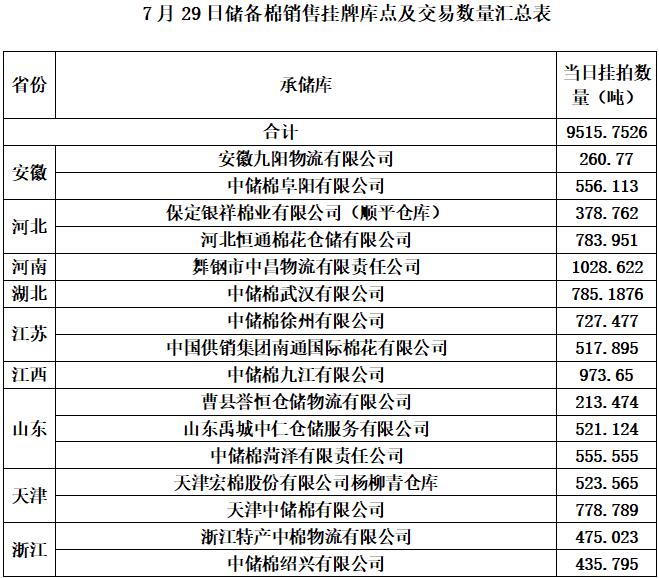 中國儲備棉管理有限公司定于7月29日上市銷售儲備棉重量9515.7526噸,共33捆,其中新疆棉6302.71噸。