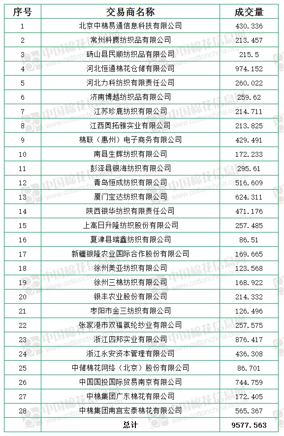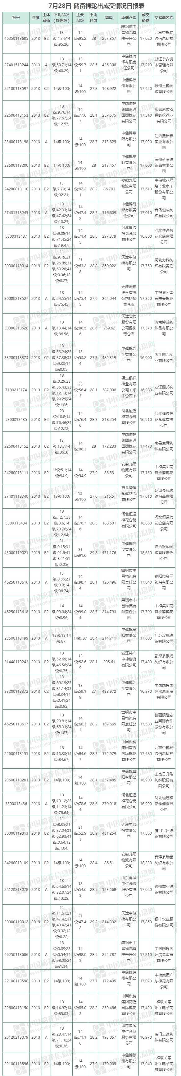 7月28日儲備棉輪出銷售資源9577.56噸,實際成交9577.56噸,成交率100%,成交均價17282元/噸,較27日下跌168元/噸,折3128價格18334元/噸,較27日下跌40元/噸。