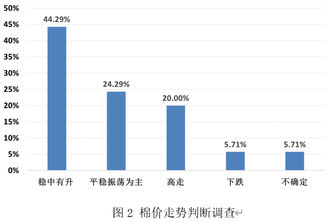 據(jù)中國棉花網(wǎng)近期調(diào)查顯示,64%左右參與調(diào)查的企業(yè)認為棉價向好趨勢明顯。其中認為棉價穩(wěn)中有升的占44%,價格高走占20%;認為平穩(wěn)振蕩的占24%,下跌和不確定合計占11%。