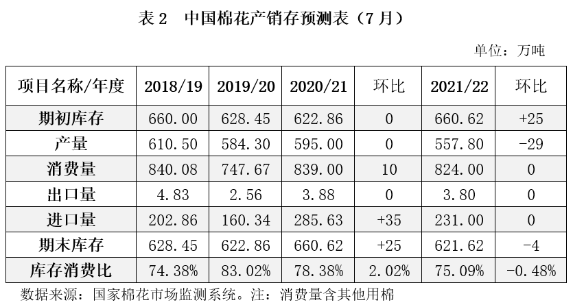 基于相關(guān)專題調(diào)查和對國內(nèi)外經(jīng)濟環(huán)境及市場狀況的分析,2021年7月國家棉花市場監(jiān)測系統(tǒng)對2021/22年度國內(nèi)棉花產(chǎn)銷存預(yù)測如下:2021/22年度我國棉花產(chǎn)量557.8萬噸,同比減少37.2萬噸,減幅6.25%;消費量824萬噸,同比減少15萬噸,減幅1.79%;進口量231萬噸,同比減少54.6萬噸,減幅19.13%;期末庫存621萬噸,同比減少39萬噸,減幅5.9%;產(chǎn)需缺口266.2萬噸,較2020/21年度擴大22.2萬噸,庫存消費比為75.44%,較2020/21年度下降3.29個百分點。