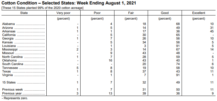 美國(guó)農(nóng)業(yè)部8月2日發(fā)布的美國(guó)棉花生長(zhǎng)報(bào)告顯示,截至8月1日當(dāng)周,美棉現(xiàn)蕾率為82%,前周為78%,去年同期為90%,五年均值為90%。美棉結(jié)鈴率為50%,前周為37%,去年同期為52%,五年均值為53%。美棉生長(zhǎng)優(yōu)良率為60%,前周為61%,去年同期為45%。